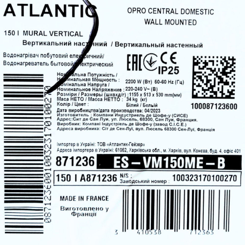Atlantic O'Pro Central Domestic Wall Mounted 150 ES-VM150ME-B (2200W) – це сучасний електричний бойлер з вертикальною установкою, який ідеально підходить для великої родини або для використання в офісі чи невеликому підприємстві. Бойлер має місткий бак 150 літрів, що забезпечує достатню кількість гарячої води. Бойлер оснащений потужним нагрівальним елементом на 2200 Вт, який швидко нагріває воду до комфортної температури. Бойлер також має ряд корисних функцій, таких як захист від перегріву, термостат і магнієвий анод, який захищає бак від корозії.
