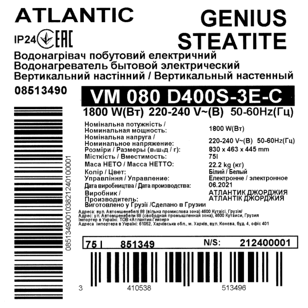 Atlantic Steatite Genius VM 080 D400S-3E-C (1800 W) – це новий електричний водонагрівач від французького бренду Atlantic, з об'ємом 80 літрів і вертикальним монтажем, який відмінно підходить для домашнього використання родиною до 3 осіб.
