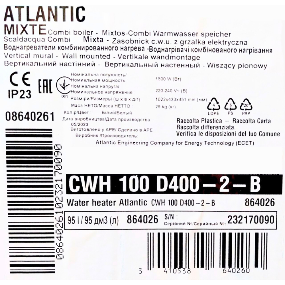 Atlantic Combi O'Pro CWH 100 D400-2-B 1500 Вт - комбінований бойлер, який використовують з опалювальними котлами разом. Термостат забезпечує керування насосом подачі теплоносія в теплообмінник. Це сучасний і надійний бойлер, який ідеально підходить для невеликих квартир або будинків. Він має місткість 100 літрів і потужність 1500 Вт, що дозволяє забезпечити гарячою водою до 4-х осіб.
