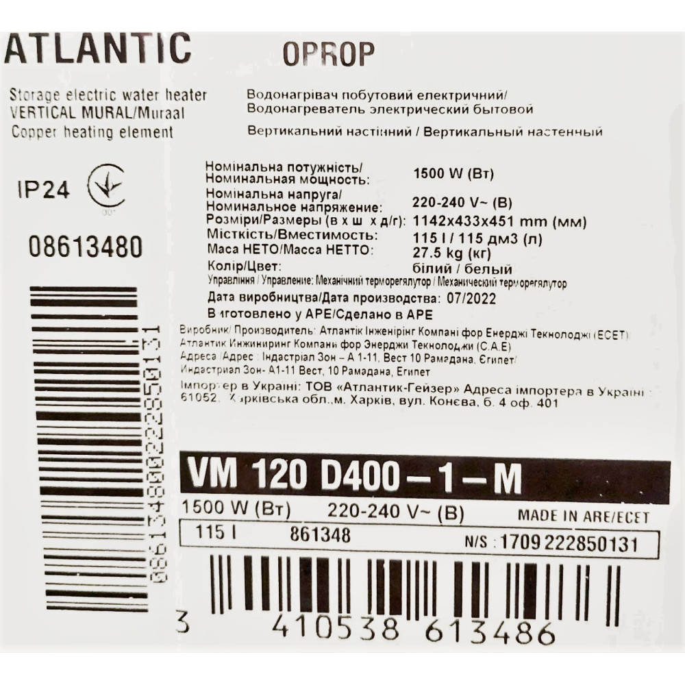 Atlantic O'Pro Profi VM 120 D400-1-M 1500 Вт – це надійний і економічний водонагрівач, який ідеально підходить для сімей з 3-4 осіб. Бойлер оснащений мідним ТЕНом, який забезпечує швидке і рівномірне нагрівання води, а також магнієвим анодом, який захищає бак від корозії. Бойлер має простий і інтуїтивно зрозумілий інтерфейс, а також зручний монтаж.