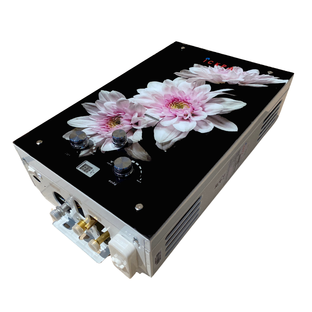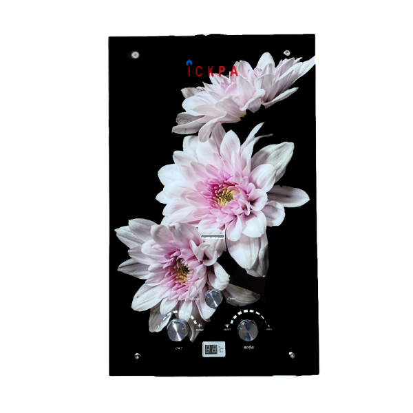 Газова колонка Іскра з малюнком "Хризантеми на чорному фоні" – водонагрівач потужністю 20 кВт, з відведенням продуктів згоряння через димар. Особливою відмінністю є наявність дисплея та 3 ручок управління: регулювання висоти полум'я, напору води та перемикач "зима-літо" для зручнішого налаштування водонагрівача в різні сезони. На дисплеї відображається потокова температура води.