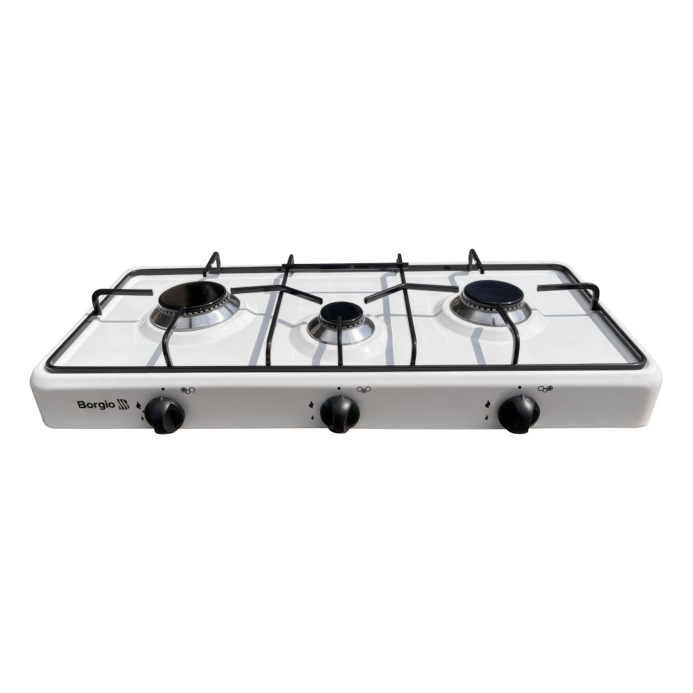 Плита газова настільна 3 конфорки Borgio 1930W - це зручне і компактне газове обладнання, ідеально підходить для місць без газопостачання, будинків, дач або гаражів, можливо навіть у польових умовах. Це пристрій, який можна легко розмістити на будь-якій робочій поверхні і який допоможе заощадити простір у заміських будинках. Ця універсальна газова плита - ідеальне рішення для тих, хто шукає оптимальну опцію для дачі та не бажає переплачувати за зайві функції.