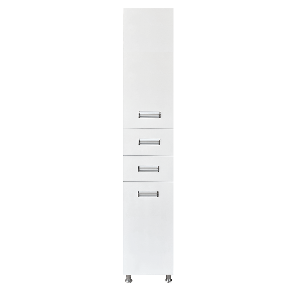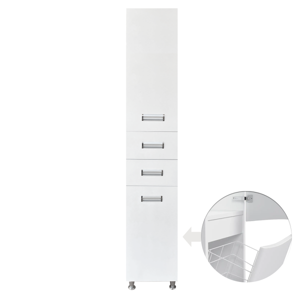 Виготовлений з міцного МДФ у білому кольорі. Пенал має три висувних ящика і одну розпашну шафку, що забезпечить зручне зберігання різних дрібниць. Окремою перевагою є нижній висувний ящик з кошиком для білизни.