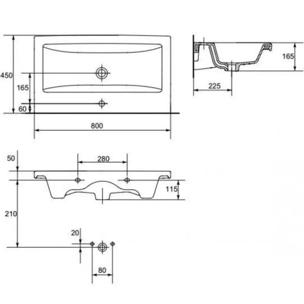 Виготовлений з якісної кераміки у білому кольорі, даний умивальник має прямокутну форму і розміри 800х450 мм.