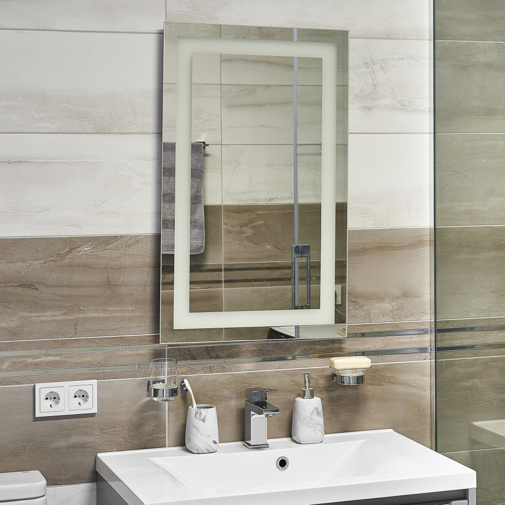 Зеркало в ванную комнату с подсветкой Unio MRR-01 SQR-AA прямоугольной формы с прямыми краями. Ширина зеркала составляет 500 мм, высота 800 мм. Толщина зеркального полотна составляет не менее 4 мм.